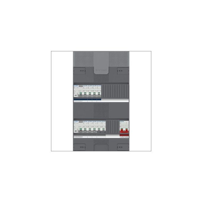 Installatiekast, 390x220x110mm, 1-fase, Beveiliging: Installatie-/aardlekautomaat, 8 groepen, Hoofdschakelaar: 2-polig, 40A, 2x aardlekschak. 30mA, Kookgroep: 1-fase, Kunststof behuizing, IP20,