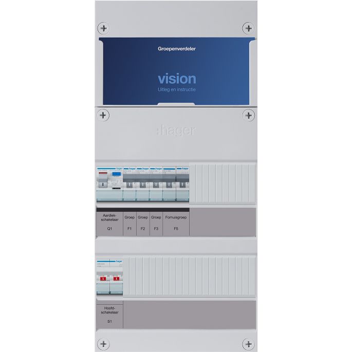 Hager VISION installatiekast, (hxbxd) 475x220x89mm, 1 fasen, beveiliging installatie-/aardlekautom, totaal aantal groepen 4, 3 lichtgroepen, 4 groepen achter aardleksch, 1 aardlekschakelaars 30mA, 2 polen hoofdschakelaar, hoofdschakelaar - nom. (meet)stroom 40A, kookgroep 1-fase,