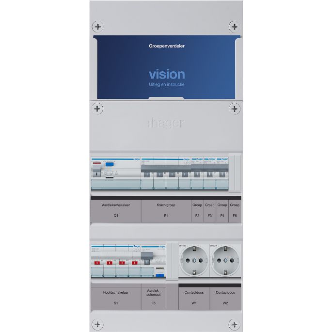 Hager VISION installatiekast, (hxbxd) 475x220x89mm, 3 fasen, beveiliging installatie-/aardlekautom, totaal aantal groepen 5, 4 lichtgroepen, 4 groepen achter aardleksch, 1 aardlekautomaten, 1 aardlekschakelaars 30mA, 4 polen hoofdschakelaar, hoofdschakelaar - nom. (meet)stroom 40A, kookgroep 3-fase,