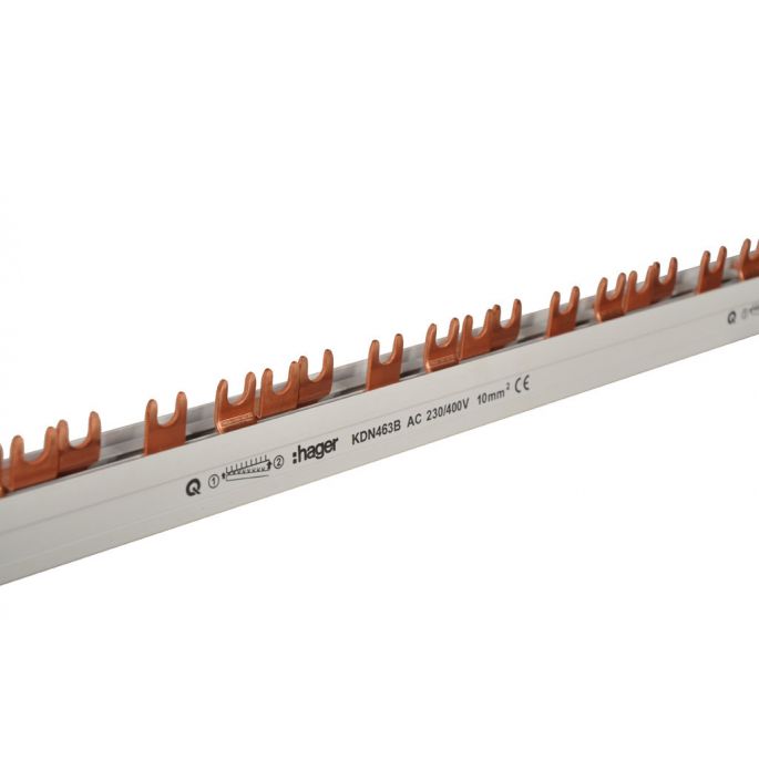 Hager Quickbusbar kamrail, grijs, diameter 10mm², lengte 1000mm, nom. continustroom Iu 63A, geschikt voor apparaten met nulgele, ten behoeve van serie(s) 4p. Installatieautomaten, uitvoering elektrische aansluiting vork, 3 fasen, geschikt voor aantal apparaten 14, combinatie met aardlekschak.,