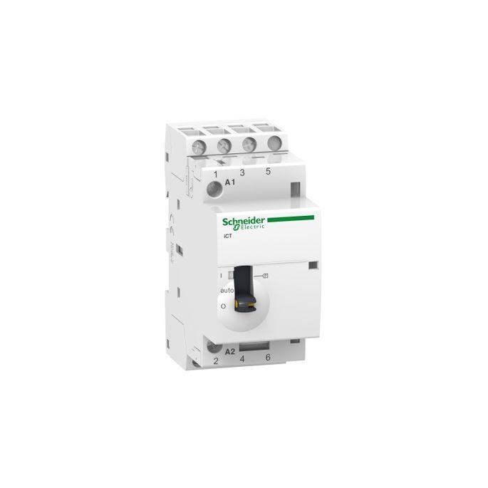 Deze Acti9 iCT is een modulaire contactor. Het is een 3P afstandsbediening en handmatige bediening met 3 normaal open contacten. De ingangsstroom is 25A voor AC-7a en 8,5A voor AC-7b. De voor de gebruiker nominale bedrijfsspanning is 400 VAC. De Uc regelsp