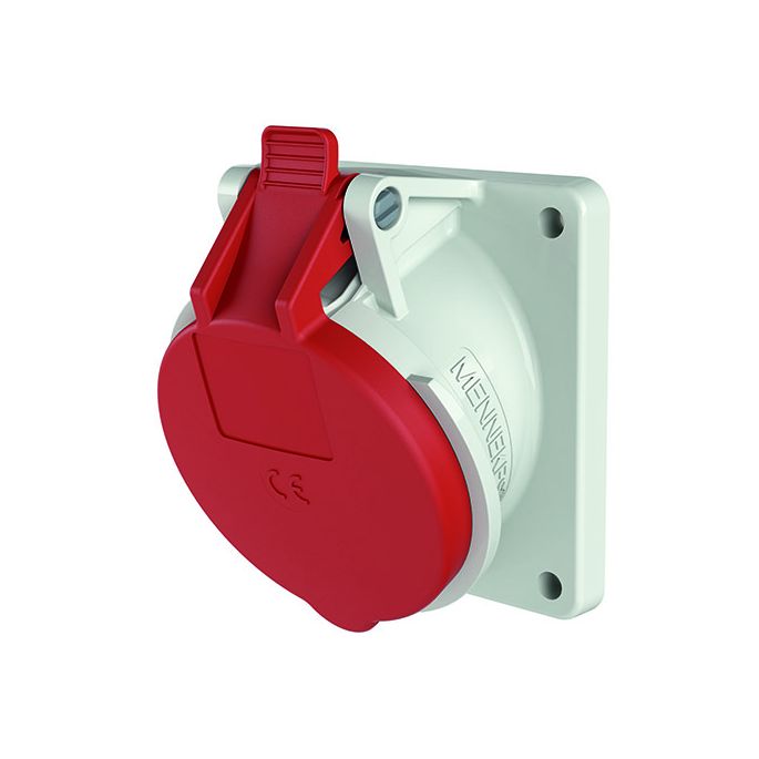 MENNEKES, CEE 3070, Contactdoos Ceeform Aanbouw, 16A, 5-polig, 400 V (50+60 Hz) rood, Uurstand 6h, IP44, Kunststof, Schuin (gehoekt), Schroefloze klem, Flens: 85x85mm, Boorgat: 70x70mm, Inbouw