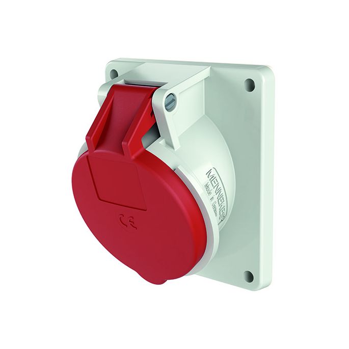 MENNEKES, CEE 3473, Contactdoos Ceeform Aanbouw, 16A, 5-polig, 400 V (50+60 Hz) rood, Uurstand 6h, IP44, Kunststof, Schuin (gehoekt), Schroefloze klem, Flens: 92x100mm, Boorgat: 77x85mm, Schuin 20gr., 100x92mm, boorgaten 77x85mm