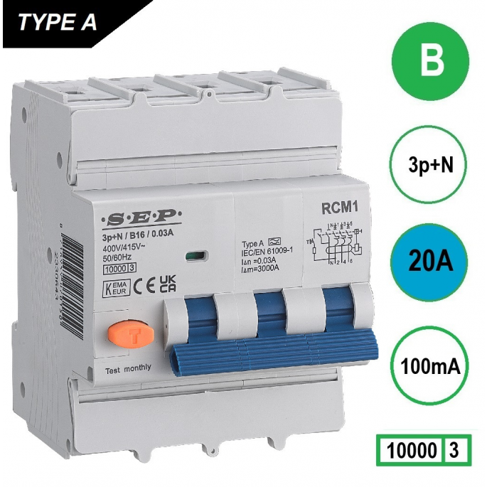SEP RCM1 Aardlekautom. 3p+n, B20, 100mA, 10kA, Type A
