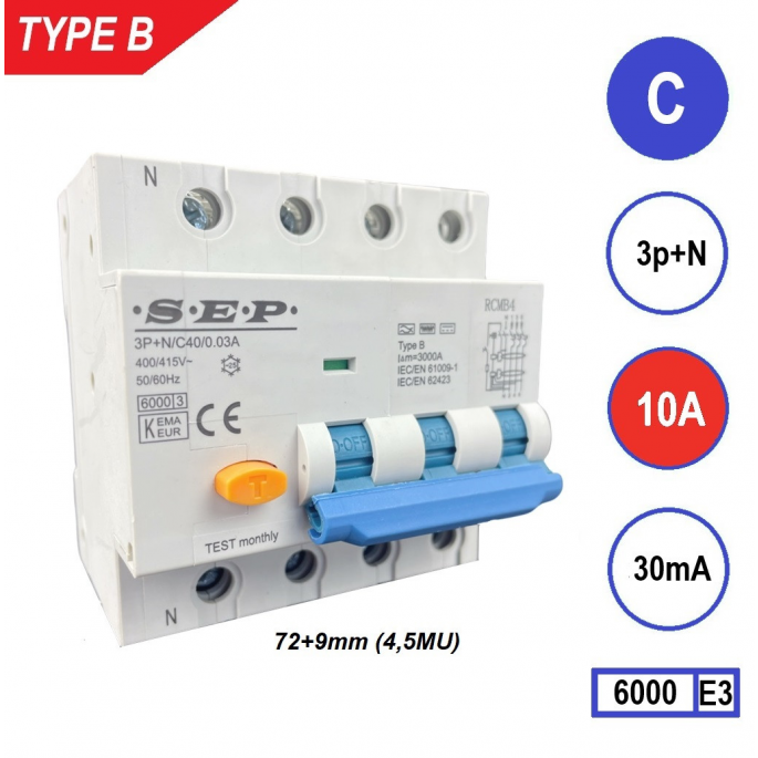 SEP aardlekautomaat type B | 10A, 30mA, C-kar, 3P+N (81mm) | RCMB-4C10.03