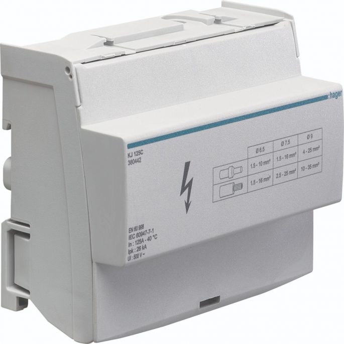 HAGER, KJ125C, Inbouwunit met verdeelklemmen, 125A, 4-polig, 48 klemposities per pool, Afmeting (HxBxD): 96x126x44mm, Aderdoorsnede massief: 1.5 - 35mm2, Aderdoorsnede soepel met huls: 1.5 - 35mm2,